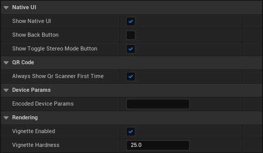 Under Project Settings > ... > Cardboard VR, you can customize several settings of the plugin. Go over each setting with the mouse pointer to open a tooltip with the detailed description. Most of the settings can be updated at run-time using methods from the UUNACardboardVRStatics class.