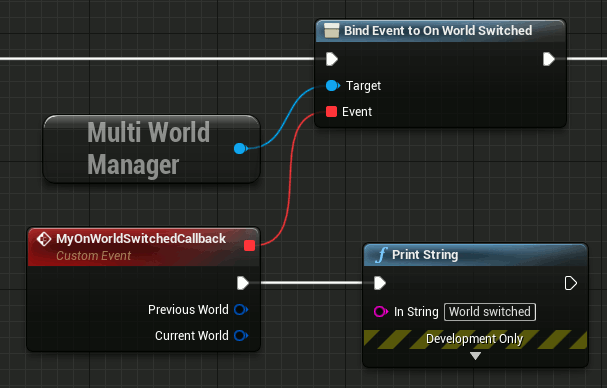 For more complex setups, you can also load worlds asynchronously using the Load World Async node or the C++ method UMultiWorldManager::LoadWorldAsync().