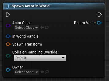 If instead you need to spawn an actor in a UWorld other that the one you're operating in (see GetThisWorldHandle), you can call UMultiWorldStatics::SpawnActorInWorld(). It's the same as the standard UE5 SpawnActor()/Spawn Actor from Class methods but accepts a World Handle that specifies in which World to spawn the new Actor.