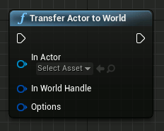If you need to transfer an actor between different UWorld instances, the plugin provides the method UMultiWorldStatics::TransferActorToWorld(). While the method UMultiWorldStatics::TransferActorToWorld() provides a convenient way to transfer an actor between different UWorld instances, and its implementation is generic enough to manage most common cases, particular actor setups or advanced uses could require a different and manual procedure. In this case, the suggested approach is to serialize the actor from the source World into a temporary buffer, destroy the actor and create a new instance in the destination World (e.g. using UMultiWorldStatics::SpawnActorInWorld()), finally restoring its state from the serialized data.