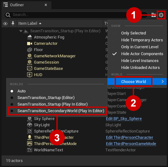 MultiWorld plugin is compatible with the UE5 Editor World Outliner. This means that, while playing in editor, you can inspect actors living in any world, including any Secondary World. You must only pay attention to manually select the World you want to inspect, not relying on the Auto option: