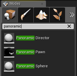To start working with a APanoramicSphere actor, you can simply place an instance of the actor in your level: search for the class PanoramicSphere in Modes > Place panel and drag it into the level.