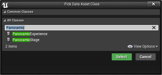 To create a new UPanoramicExperience asset: in the Content Browser*press the *Add New button and then select Miscellaneous > Data Asset. Search for PanoramicExperience and then click on Select. Choose a name for this experience and then press Enter to confirm.